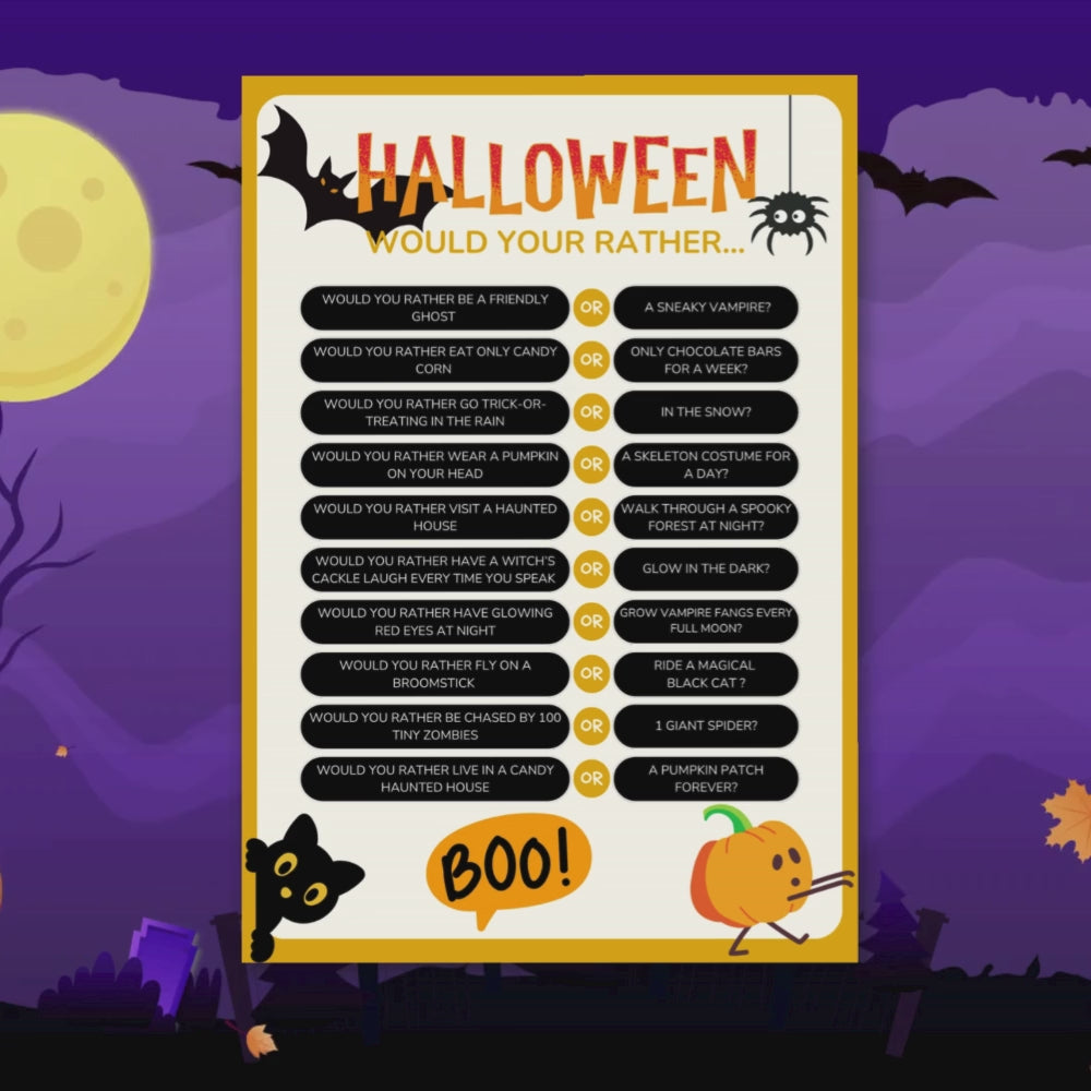 Spice up spooky season with this Halloween Would You Rather Game! Perfect for kids, families, classrooms, or parties, this printable is filled with silly and spooky questions that get everyone laughing and talking. Best of all, it comes with a PLR license, so you can rebrand, edit, and resell it as your own.